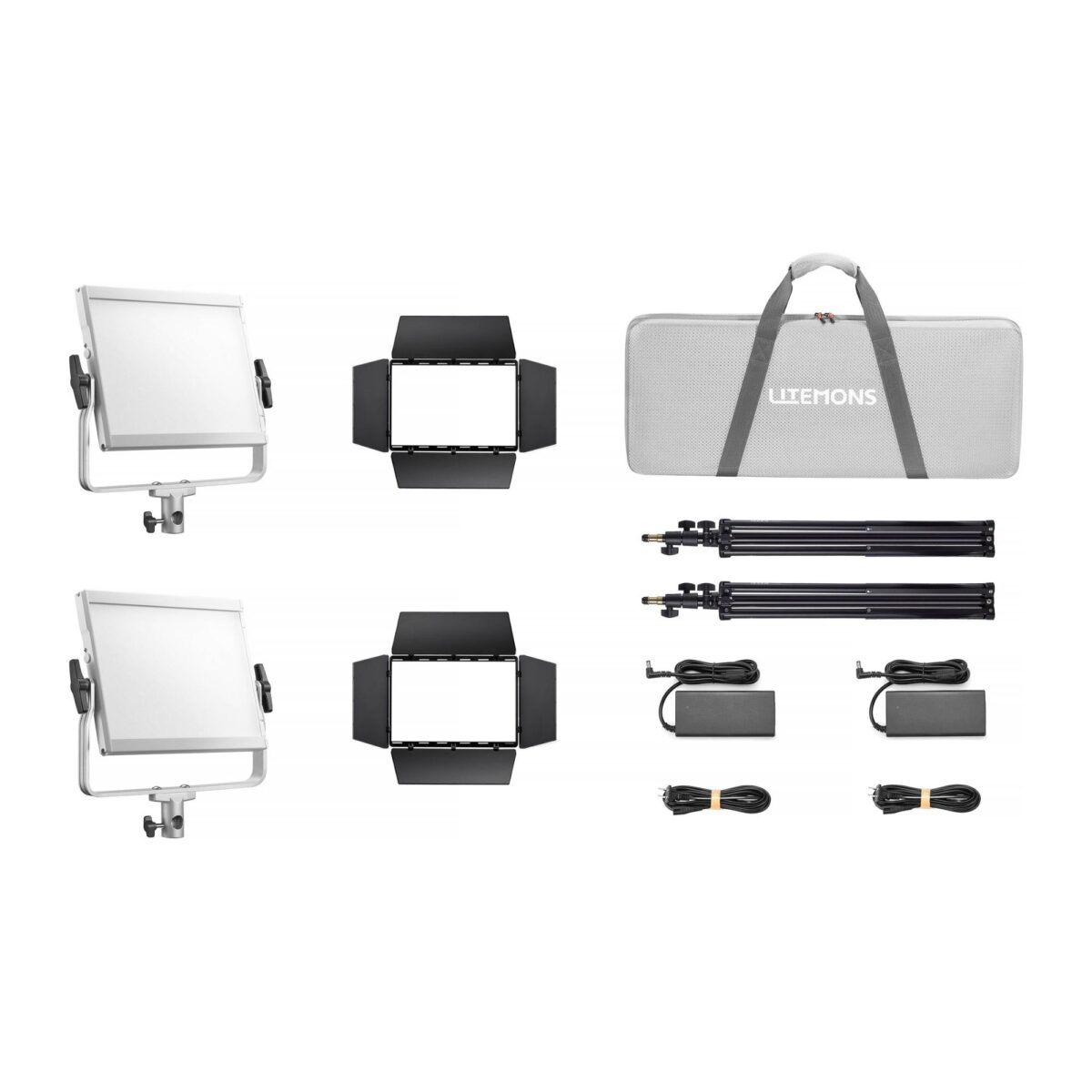 Η συσκευασία περιλαμβάνει: 2x φωτιστικό με σύστημα yoke για ρύθμιση κλίσης, 2x μετασχηματιστή ρεύματος, 2x καλώδιο ρεύματος, 2x πτερύγια, 2x light stand, τσάντα μεταφοράς.