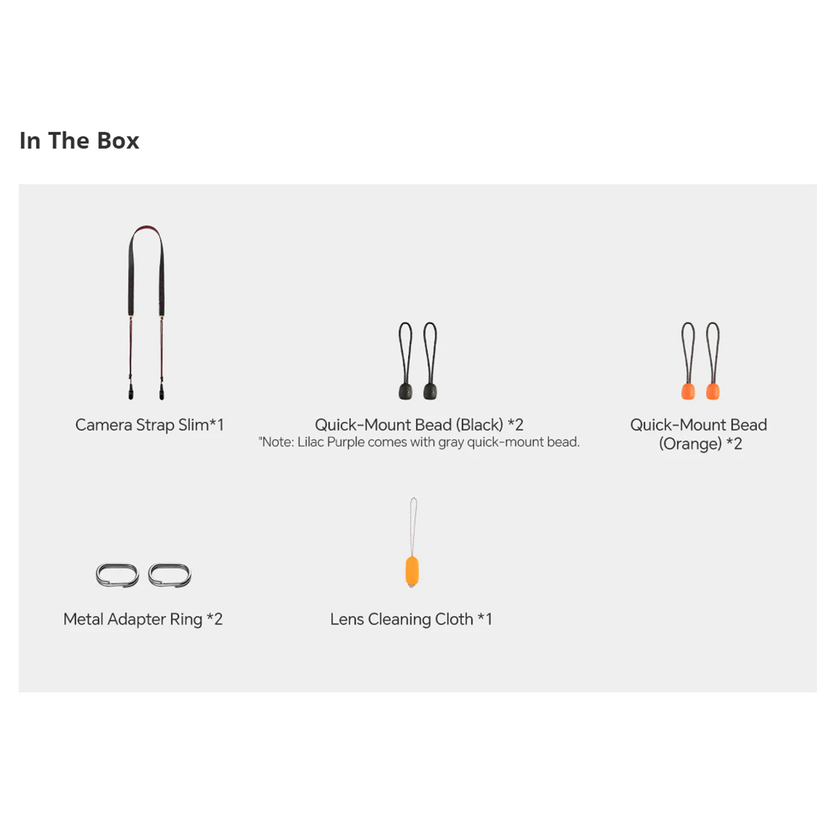 Η συσκευασία περιλαμβάνει: 1x Camera Strap Slim, 1x πανί καθαρισμού φακού (L), 2x Quick-Mount Bead (Μαύρο), 2x Quick-Mount Bead (Πορτοκαλί), 2x μεταλλικούς δακτυλίους προσαρμογής (Metal Adapter Ring), 1x εγχειρίδιο χρήσης