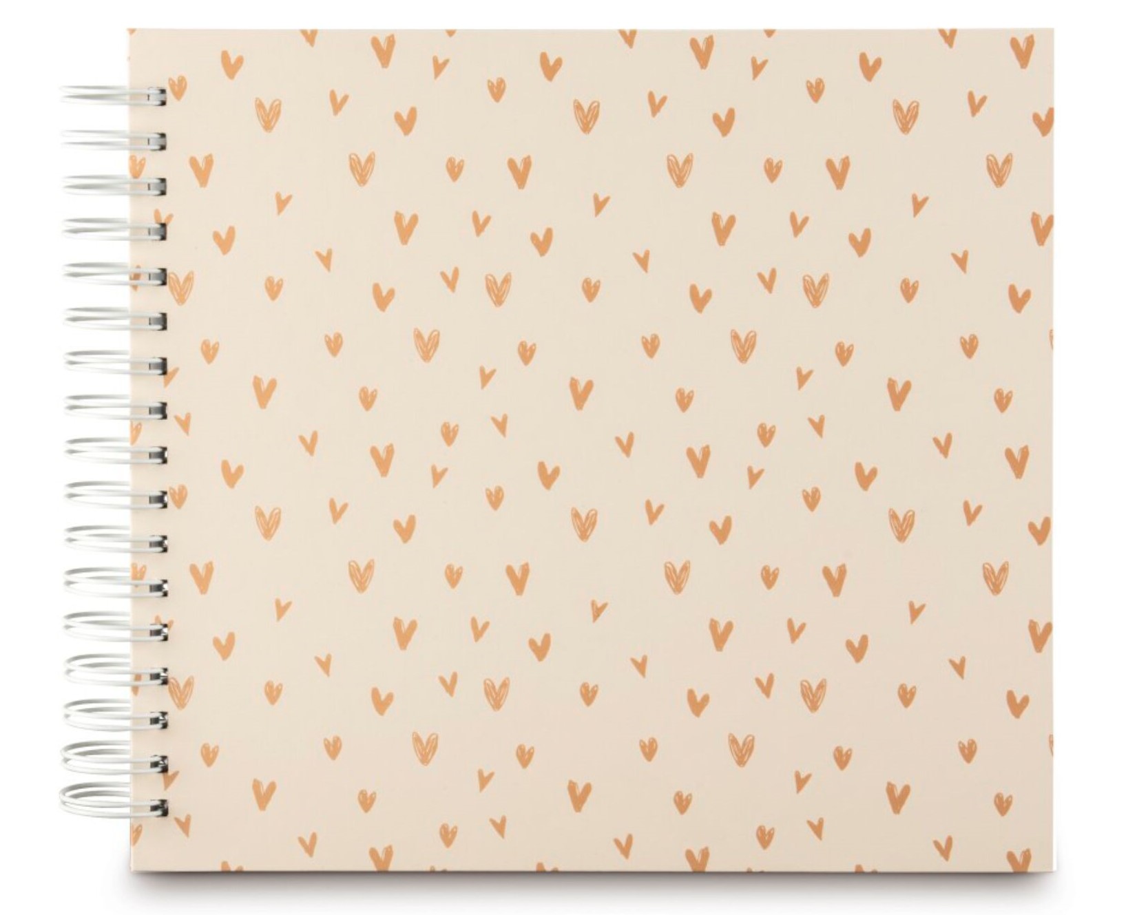 Με διαστάσεις 28×24 cm, περιλαμβάνει 50 λευκές σελίδες, προσφέροντας πλήρη ελευθερία στη διάταξη των φωτογραφιών και δημιουργικό χώρο για σημειώσεις, σχέδια ή scrapbooking. Το σπιράλ δέσιμο επιτρέπει εύκολο ξεφύλλισμα και σταθερότητα, ενώ το σκληρό εξώφυλλο σε μπεζ απόχρωση με καφέ καρδιές προσδίδει μια διαχρονικά ρομαντική εμφάνιση.