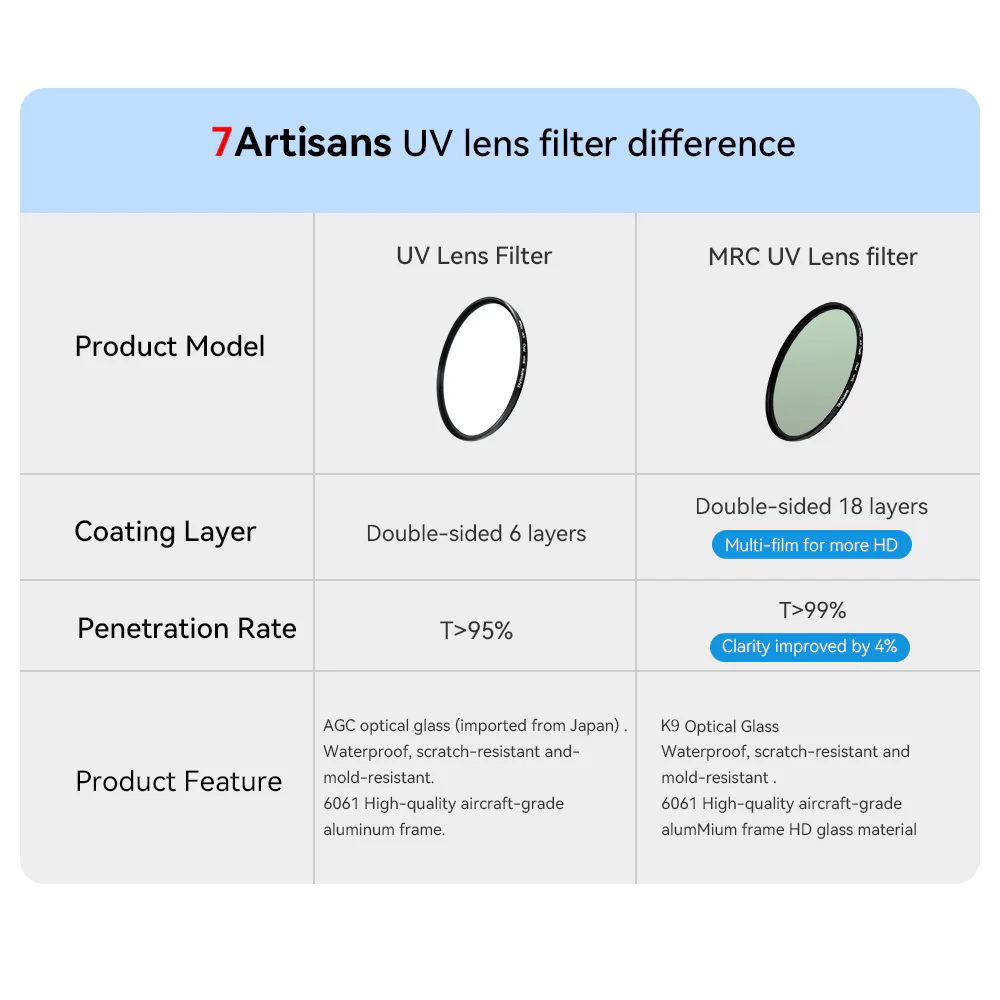 Το 7artisans Slim Pro MRC UV 43mm είναι ένα ποιοτικό φίλτρο προστασίας φακού που συνδυάζει οπτική καθαρότητα και ανθεκτική κατασκευή σε ένα εξαιρετικά λεπτό προφίλ. Σχεδιάστηκε για φακούς διαμέτρου 39mm και αποτελεί ιδανική επιλογή για mirrorless και compact συστήματα, όπου το μικρό μέγεθος και το χαμηλό βάρος παίζουν σημαντικό ρόλο στη φορητότητα του εξοπλισμού. Η βασική του λειτουργία είναι η απορρόφηση της υπεριώδους ακτινοβολίας, μειώνοντας τη θαμπάδα και βελτιώνοντας την καθαρότητα της εικόνας, ιδιαίτερα σε εξωτερικές λήψεις με έντονο φυσικό φως.