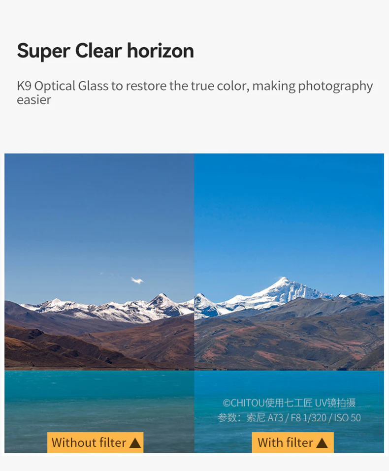 Η κύρια λειτουργία του φίλτρου UV (Ultraviolet) είναι να μπλοκάρει την υπεριώδη ακτινοβολία που μπορεί να προκαλέσει ανεπιθύμητη θαμπάδα ή μειωμένη αντίθεση στις εικόνες, ειδικά σε σκηνές με έντονο φως ή σε υψόμετρα όπου η υπεριώδης ακτινοβολία είναι πιο ισχυρή. Το φίλτρο αυτό δεν επηρεάζει τη θερμοκρασία χρώματος της εικόνας, προσφέροντας ουδέτερο αποτέλεσμα, ώστε να διατηρείς τα χρώματα πιστά προς την πραγματικότητα χωρίς να απαιτείται επιπλέον διόρθωση κατά την επεξεργασία.