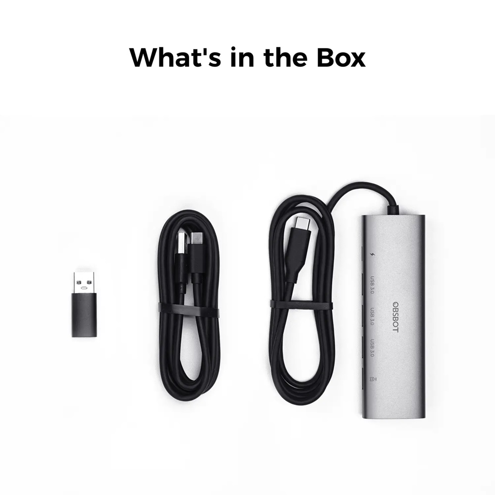 H συσκευασία περιλαμβάνει: 1x OBSBOT 3-in-1 USB 3.0 Hub, 1x USB-A to USB-C Cable, 1x USB-C to USB-A 3.0 Adapter