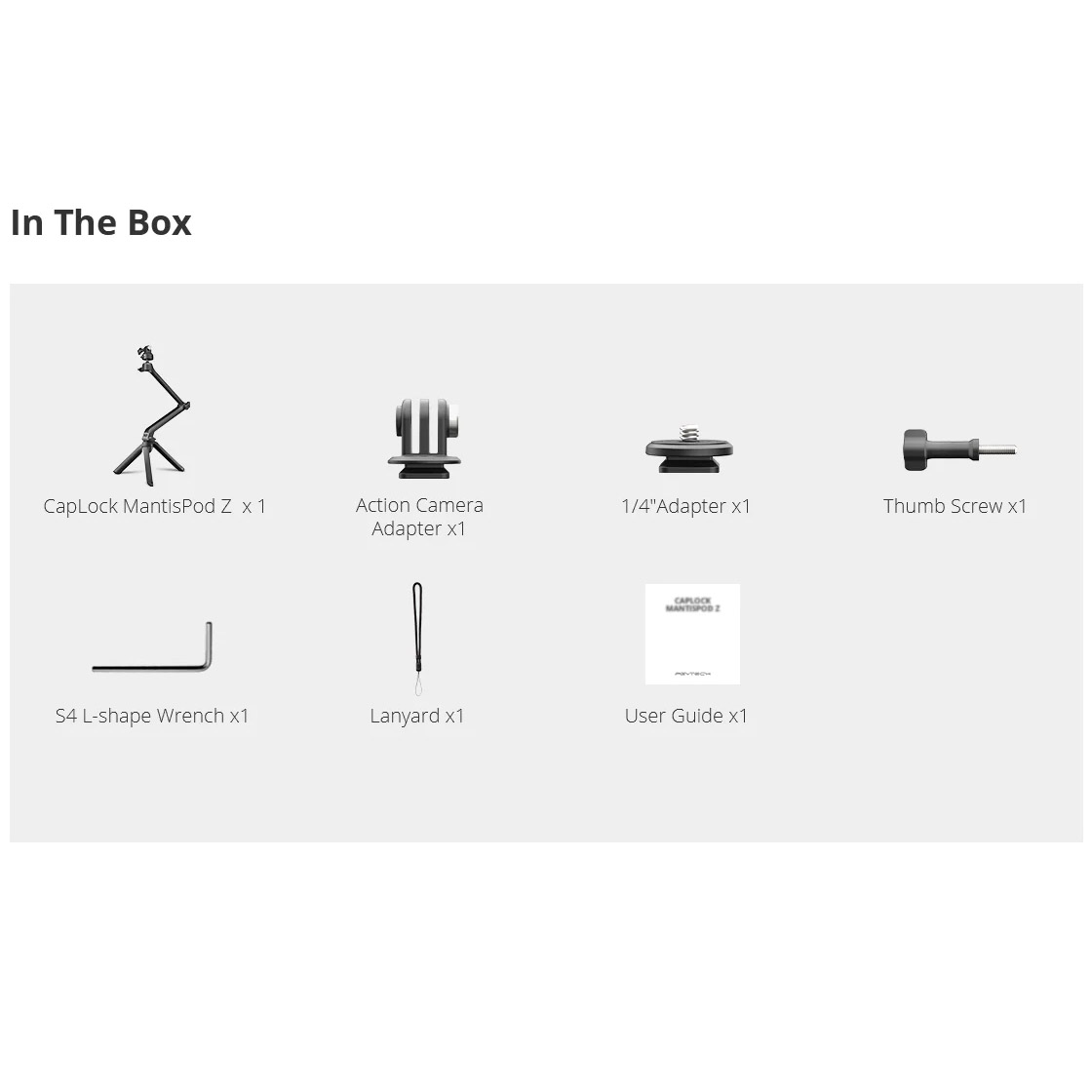 Η συσκευασία περιλαμβάνει: τρίποδο, Action Camera Adapter, βίδα, πλακάκι με βίδα 1/4″ , άλεν, κορδόνι ασφαλείας