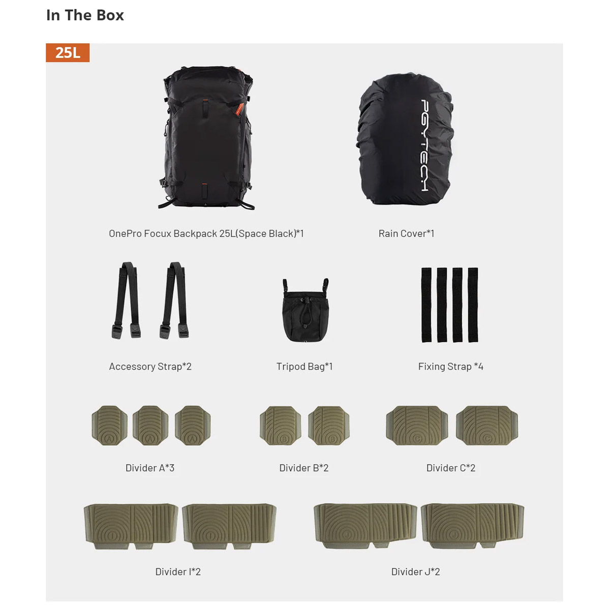 Η συσκευασία περιλαμβάνει: Backpack, θήκη τριπόδου. κάλυμμα βροχής, 2 x Accessory Strap, 4 x Fixing Strap, 11 x Interior Divider