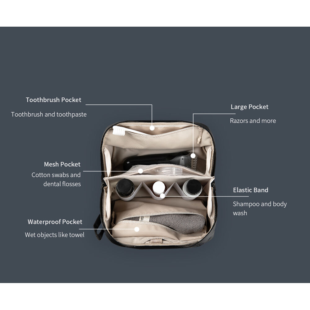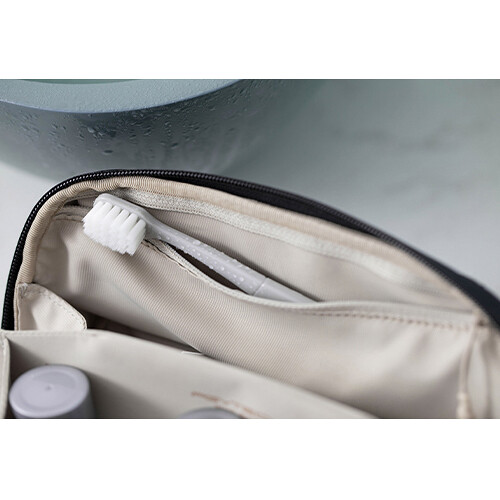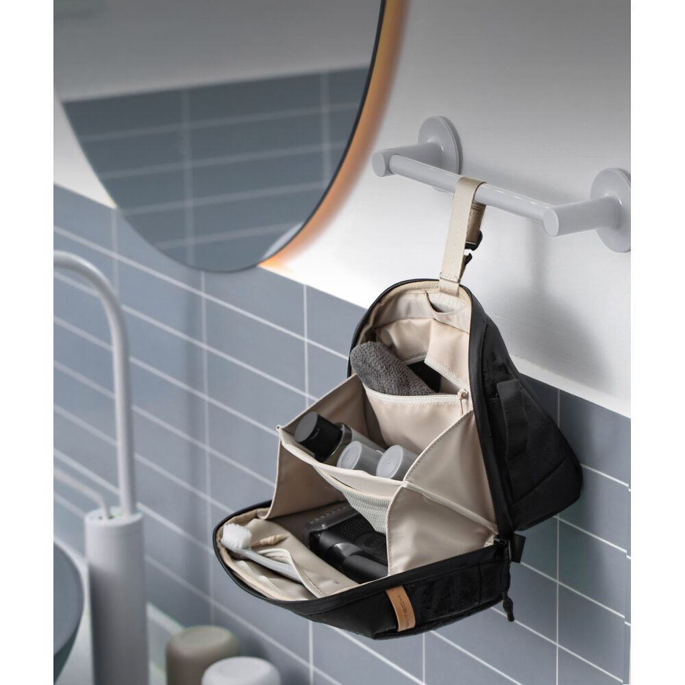 Δύο εσωτερικές τσέπες με φερμουάρ διασφαλίζουν ότι τα βρεγμένα και στεγνά αντικείμενα σας παραμένουν ξεχωριστά. Ελαστικοί ιμάντες συγκρατούν μπουκάλια σαμπουάν ταξιδιωτικού μεγέθους και καθαρισμού σώματος ενώ επίσης υπάρχουν ειδικές τσέπες για την οδοντόβουρτσα, το ξυράφι και το οδοντικό νήμα σας. Ειδικός ιμάντας σάς επιτρέπει να κρεμάτε το νεσεσέρ σας από μια ράβδο κουρτινών μπάνιου ή γάντζο για γρήγορη και εύκολη πρόσβαση στα αντικείμενά σας. Τόσο η εξωτερική όσο και η εσωτερική επένδυση είναι είναι αδιάβροχες και καθαρίζονται εύκολα.