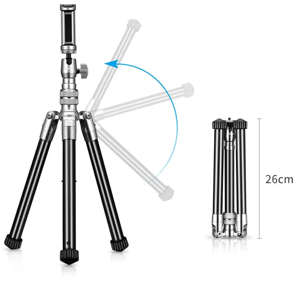 Εκτός από τα τρία πόδια που αναδιπλώνονται για εύκολη αποθήκευση, ο κεντρικός στύλος διπλώνει επίσης. Όταν είναι πλήρως κλειστό, το τρίποδο έχει μήκος μόνο 26 cm.